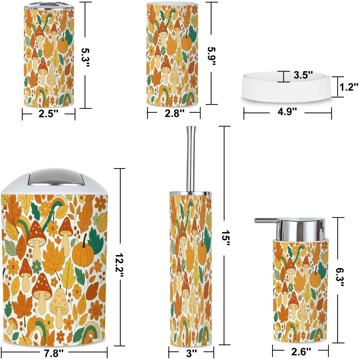 Includes 6 pieces: -Soap dish Keep soap dry. Keep the sink dry without soap stains. -Soap dispenser Press with one hand and it will automatically rebound. You can also put other liquids such as hand soap, dishwashing liquid, lotion, shampoo, shower gel, massage oil, etc. -Toothbrush cup The size is slightly different from the toothbrush holder, which is easy to distinguish. -Toothbrush holder The lid is a petal design, which can keep each toothbrush separate from each other and keep it dry and tidy. The lid is detachable, and you can also use it as another toothbrush cup with your family after removing the lid. -Trash can With a rotatable lid to prevent garbage from being exposed and fix the garbage bag. -Toilet brush The lid is designed not to dirty your hands, and odor will not escape. Attention: 1. Due to manual measurement, there may be slight differences in size. Please confirm the size before purchasing. 2. We will serve you carefully, please ask us if you have any questions.