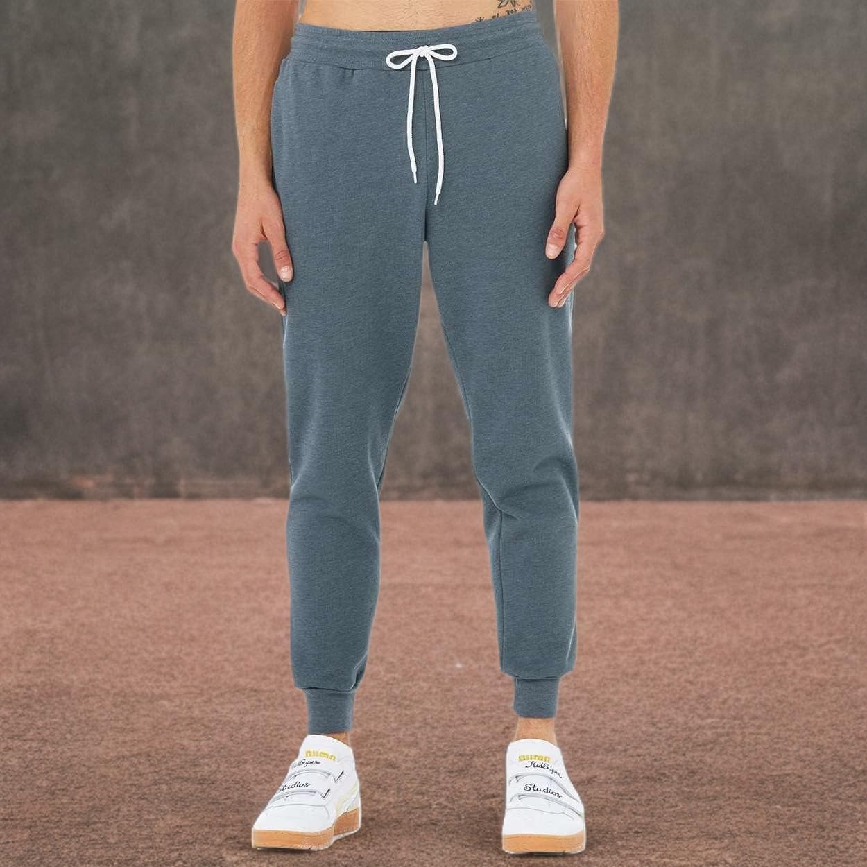 Side pockets. White cord drawstring. Cuffed bottom. 52% combed and ring-spun Cotton, 48% Polyester fleece.