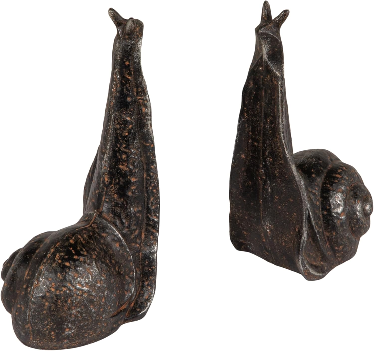 These distressed gold cast metal snail bookends are a fun and unique way to organize and decorate the book collection. They are made of cast metal, which is a sturdy and heavy material that can hold up books of different sizes and weights. They have the silhouette of two snails, which are symbols of patience and perseverance. They have a distressed gold finish that gives them a shimmering and antique look, adding some cottage-inspired charm and whimsy to the home décor. They can be used as a set or separately for display. They are suitable for any cottage, farmhouse, or rustic style of home décor, as they complement any color scheme and material. They are great for animal lovers or book enthusiasts. Each bookend measures 5.25 inches long, 3.5 inches wide, and 9 inches high. To maintain their beauty, simply wipe them with a dry cloth. These bookends are a versatile and stylish addition to any home.