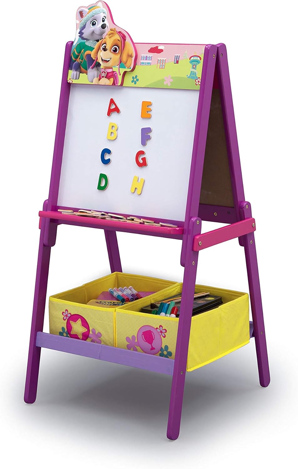 Sure to inspire the sweetest sketches, this Paw Patrol Wooden Double Sided Activity Easel with Storage from Delta Children is designed with a magnetic, dry-erase surface on one side and a chalkboard on the other. Featuring a cute silhouette of your child's favorite canines on top, it includes a magnetic character puzzle, alphabet magnets and two fabric bins underneath, so your child can store chalk, markers and all their works of art.