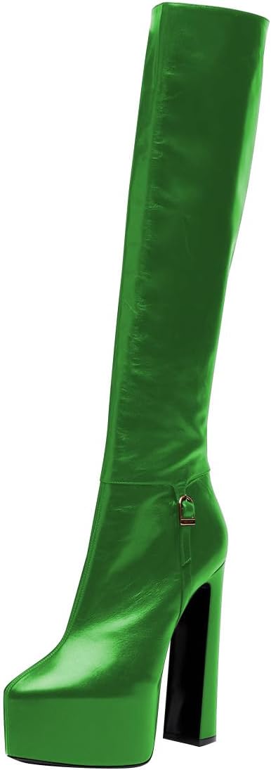 FOWT Women Pointed Toe Knee High Boots Platform Chunky Block High Heels Side Zipper Sexy Party Club Shoes Size 4-16 US