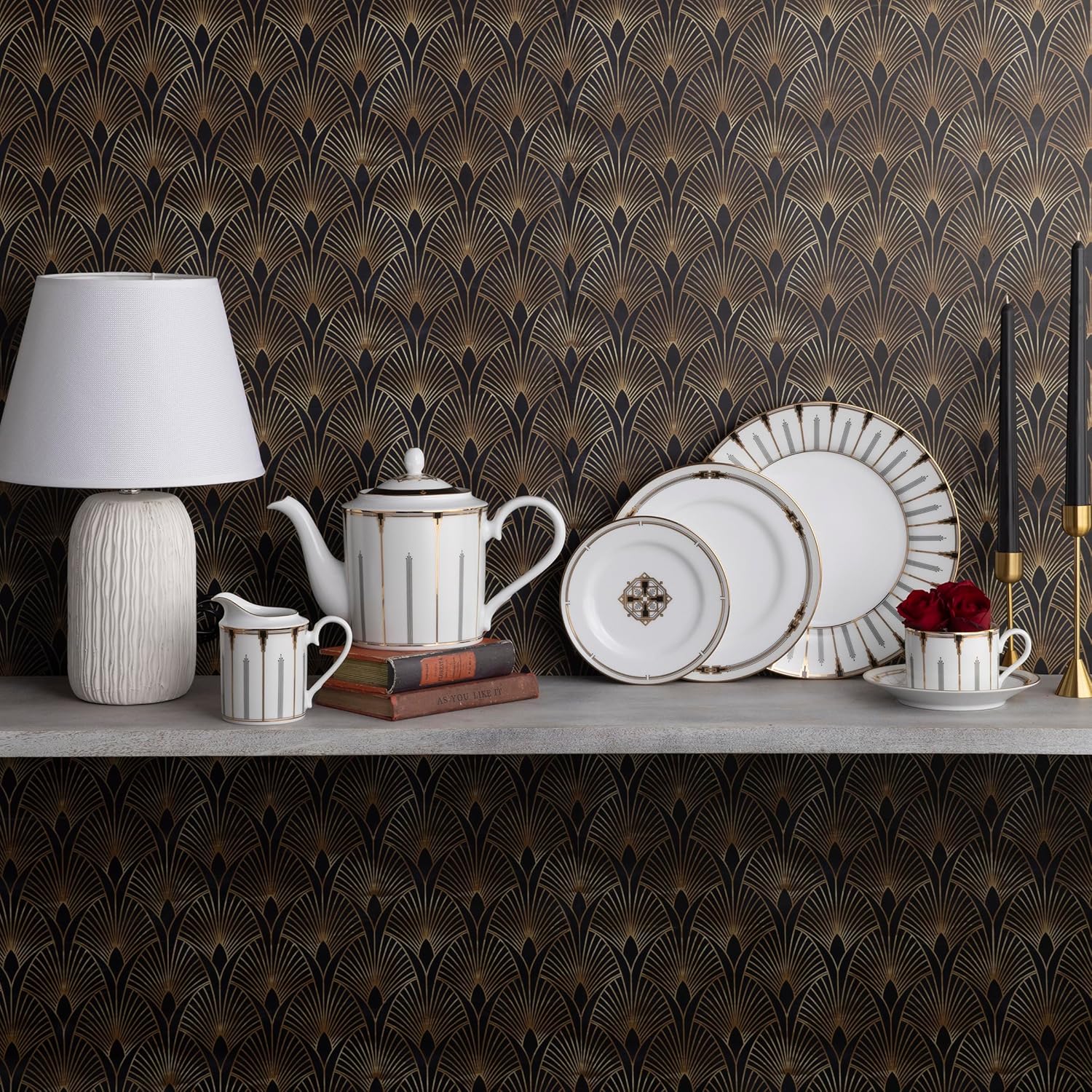 Empire Gold brings Art Deco opulence to the table. Crafted on fine white porcelain, the items feature multiple interpretations of classic Art Deco elements, from the skyscraper-type towers to the center decals which feature the classic symmetrical elements of the style. To perfectly complement the design, each piece is banded in dazzling gold. Empire Gold is designed for daily use.