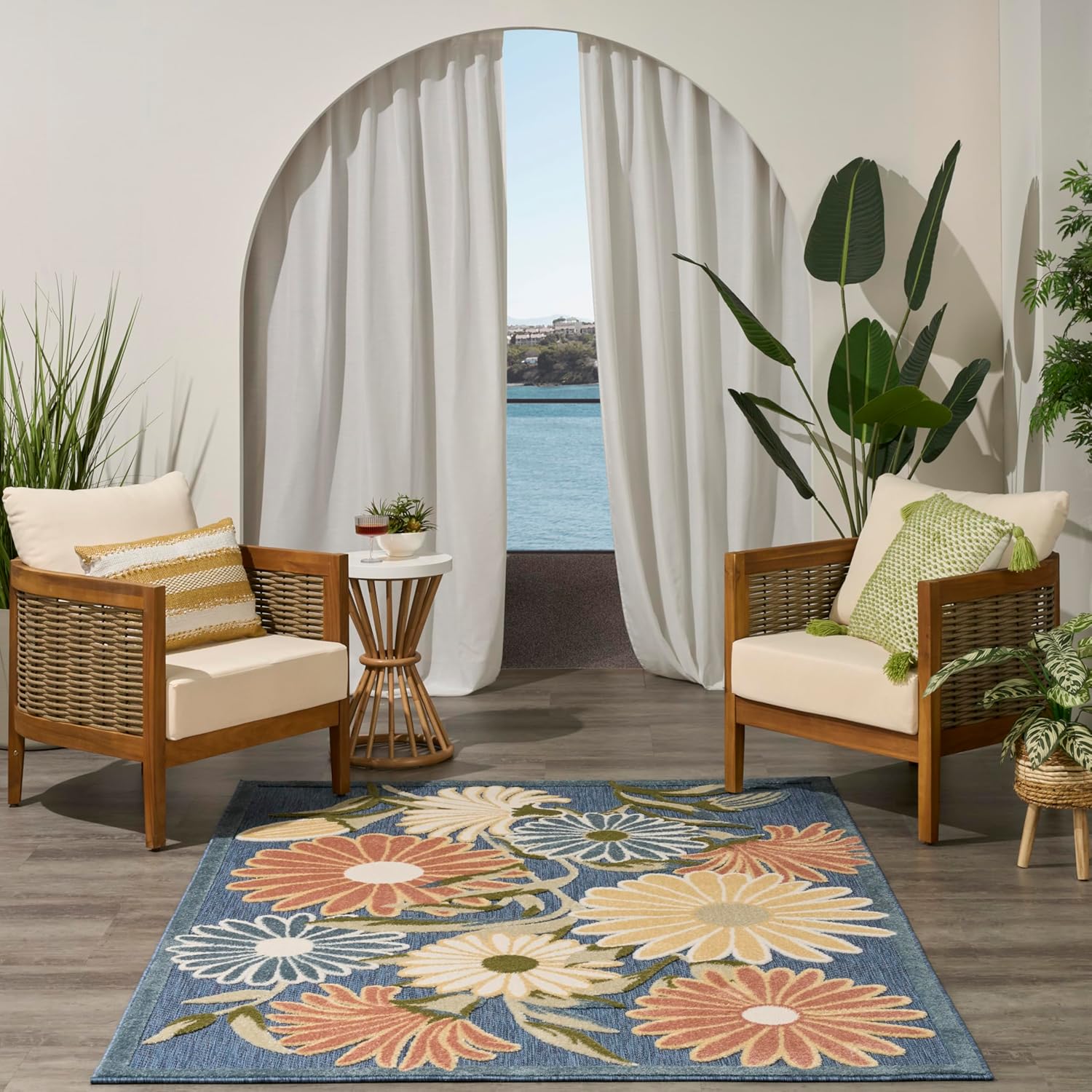 This sunny and sensational collection of flat woven outdoor rugs is pretty, practical and simply perfect for high traffic areas. With its inviting assortment of classic and contemporary designs, tempting color palettes and terrific textures, these multipurpose rugs will afford an air of simple sophistication to any environment.100% Polypropylene • Flat Woven Bring a touch of nature to your floors with this multicolored floral outdoor rug from the Aloha Collection. The oversized daisy pattern truly pops thanks to a subtly raised finish that adds a surprisingly soft texture to the flatwoven surface. Made from durable, stain-resistant polypropylene yarns that are easy to clean, this contemporary rug pulls double duty as a foundation for both your indoor and outdoor spaces.